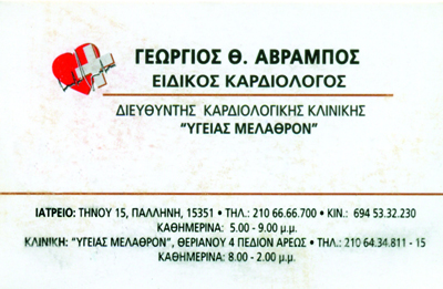 Διευθυντής Καρδιολογικού Τμήματος Κλινικής Υγείας Μέλαθροντηλ.: 2106434811-15 Καθημερινά 08:00-14:00